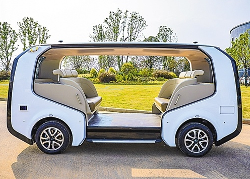 東風公司研制的首款融合5G遠程駕駛技術(shù)的無人駕駛小巴Sharing-VAN,沒有方向盤、油門和剎車,車內(nèi)如同客廳。 圖片來源:經(jīng)濟日報 張敏攝