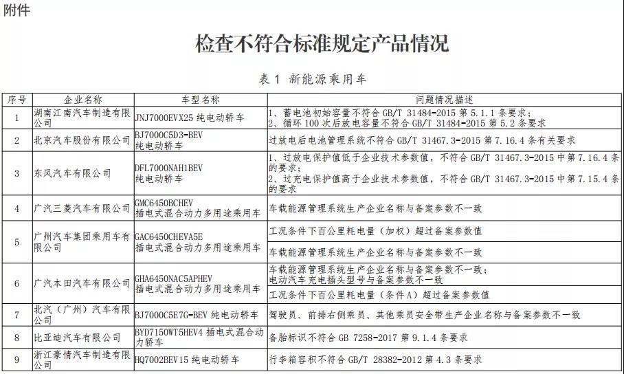 其中在新能源乘用車方面,共涉及9家企業(yè)的9個(gè)車型產(chǎn)品,涉及動(dòng)力電池容量和保護(hù)功能、行李箱容積、輪胎規(guī)格、標(biāo)志標(biāo)識(shí)等項(xiàng)目不符合國家標(biāo)準(zhǔn)或管理規(guī)定。