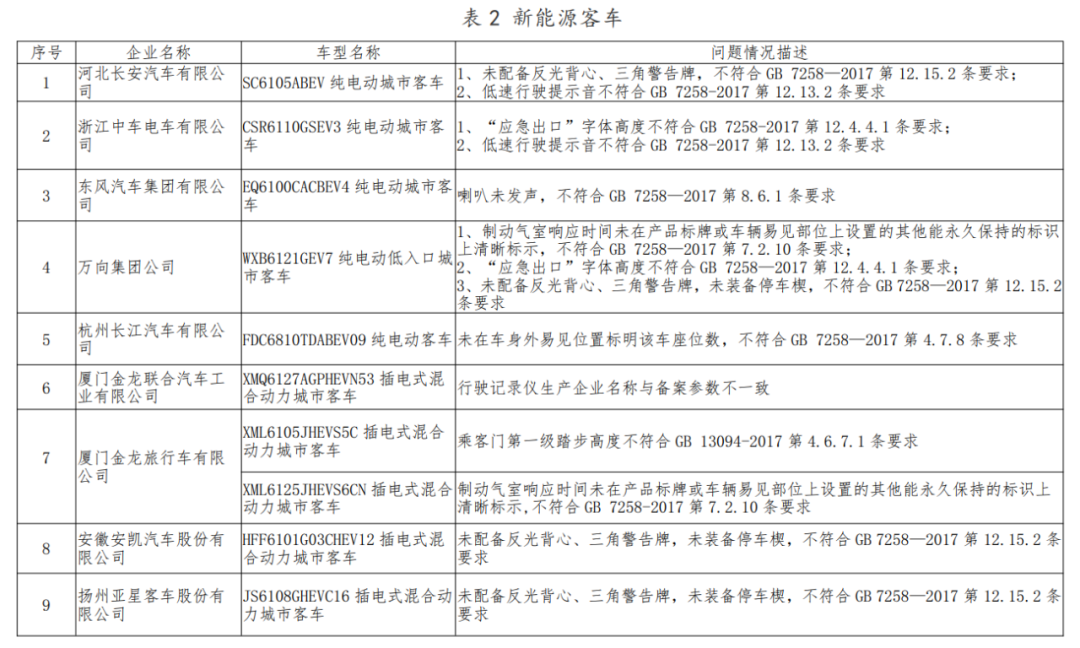 而在新能源客車方面,共涉及10家企業(yè)的12個(gè)車型產(chǎn)品,涉及低速行駛提示音、車輛喇叭、三角警告牌、標(biāo)志標(biāo)識(shí)等項(xiàng)目不符合國家標(biāo)準(zhǔn)或管理規(guī)定。