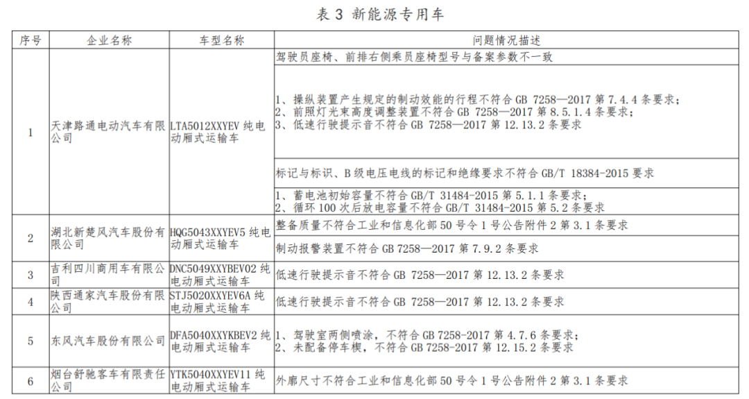 新能源專用車方面,共涉及6家企業(yè)的6個(gè)車型產(chǎn)品,涉及動(dòng)力電池容量、報(bào)警信號(hào)、低速行駛提示音、標(biāo)志標(biāo)識(shí)等項(xiàng)目不符合國家標(biāo)準(zhǔn)或管理規(guī)定。